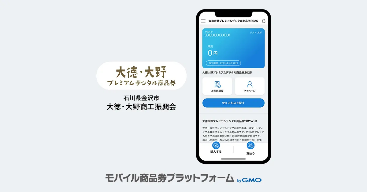 『モバイル商品券プラットフォーム byGMO』は、消費者がスマートフォン上で「プレミアム付商品券」などの電子商品券を購入できる、地域振興を応援するプラットフォームです。